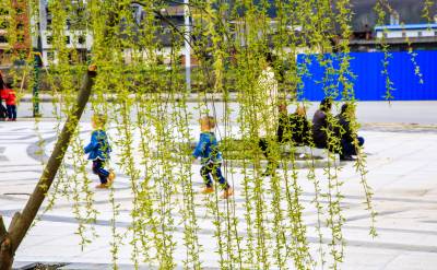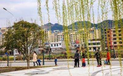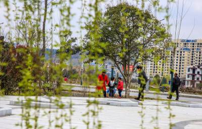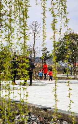 2017年03月16日,游客和当地市民带着孩子在竹县才建成景廓雏形的“母亲河”河堤上开心的游乐赏景。