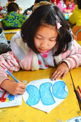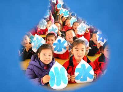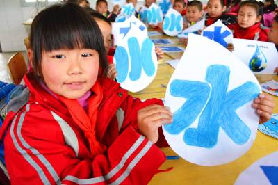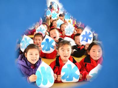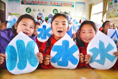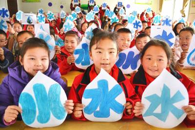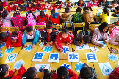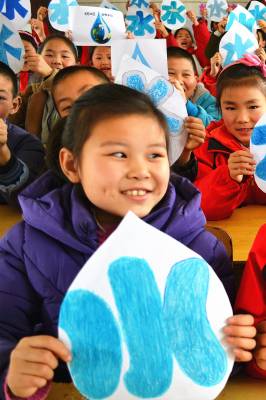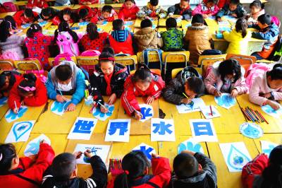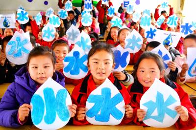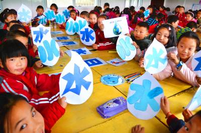 2017年3月17日,小学生在展示创作的节水主题剪纸和绘画作品。当日,南水北调中线水源区的湖北十堰市郧阳区柳陂镇中心小学开展了一场别开生面的“珍惜水资源、节约‘每一滴水’”主题节水护水科普教育活动,学校组织100多名“水源娃”或剪或画创作出各种“水字”“水滴”等美术作品,培养孩子们节水、爱水、护水的意识,以迎接3月22日“世界水日”的到来。