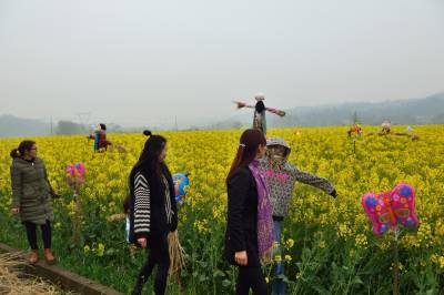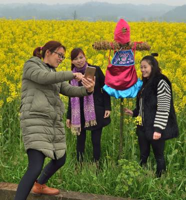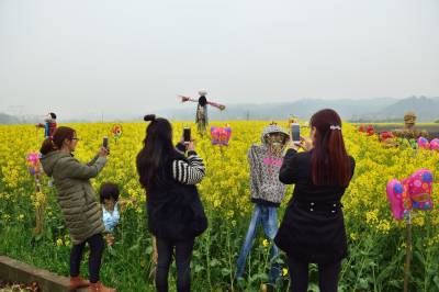 稻草人列队迎客 3月17日,宜都市枝城镇洋津畈村观光油菜花田边,游人在插有稻草人的油菜花中拍照留念。洋津畈村2016年被湖北省授予最美乡村,村内油菜花一千多亩。村党总支村委会挖掘民间艺术——稻草人,将稻草人与油菜花有机嫁接,吸引众多游客前来观光。
