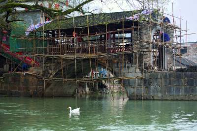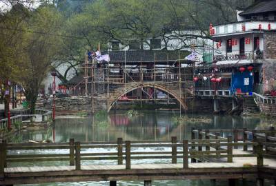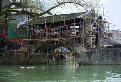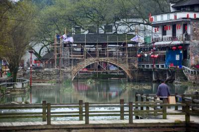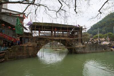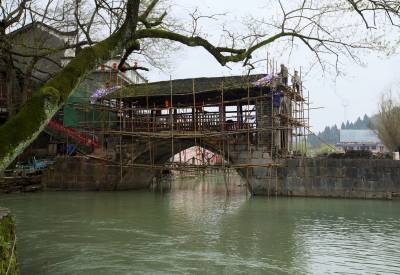 3月21日,工人们正在对咸宁市咸安区刘家桥古民居风雨桥进行修缮。刘家桥古民居群始建于明成化9年,是汉高祖刘邦胞弟楚元王刘交后裔刘伯常始建,4处古民居建筑群总面积达3.5万平方米,被誉为“楚天民俗第一村”。近几年,古民居破损现象越来越多,为更好地保护古民居,打造以旅游休闲、生态林业和现代农业为特色的新农村示范带,咸安区于近期启动刘家桥古民居修缮项目,投入专项资金230万元,对风雨桥、上新屋、彭城世家三处进行保护性修缮,修缮工期6个月,围绕“修旧如旧、减少干预”的原则,采用传统工艺进行修复,以求最大程度的恢复古民居原貌。