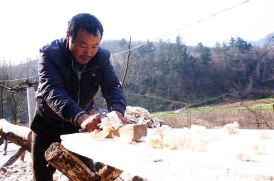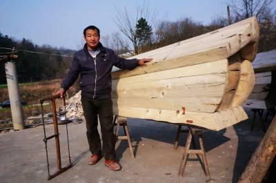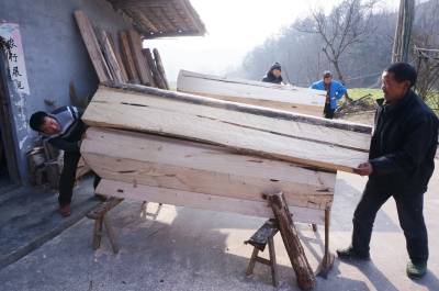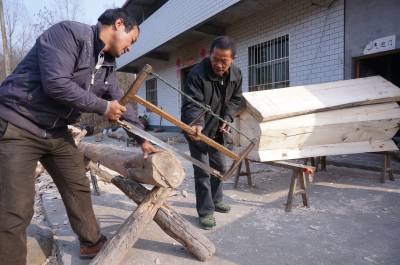 在肖家河村一组41岁的肖志涛在65多岁的肖明军师傅指导下己经做好了两副寿木,正在做第三幅寿木。做寿木首先是选材,然后是将圆木结好尺寸,用斧子砍出四方,在四方长条木上用凿子人工打出几道孔,将几个四方长条木串起来形成厚厚的一面板材,四块厚厚的板材组合成四方形的寿木雏形,两头用厚木方板一堵组合好一副寿木就完工了,用时提前几天上油,做一副手工寿木需耗时5天,工钱700元钱。41岁的肖志涛25岁开始学徒,后在外地打工,干过做家俱,干过建筑工地,如今活路不好找,干了也不太好要工钱,只得回老家跟师傅一起给人手工做寿木了。65多岁的肖明军师傅12岁跟人学徒,处中毕业后在外打工十几年,干装修、打家俱、干建筑、修公路,只要有木匠活就去干,37岁那年得了肠梗阻,大手术后失去了劳动力成了村里的贫困户,现在只能给徒弟打下手,2016年全年也只做了四副寿木,谈起今后的生活肖明军师傅显的很无耐。