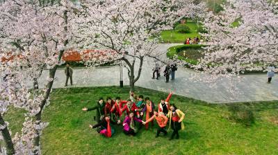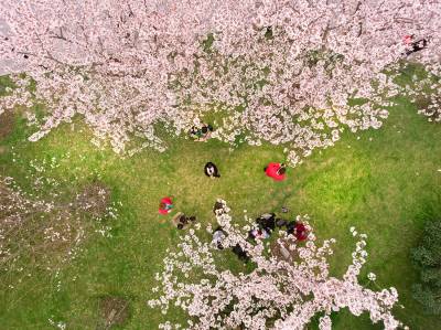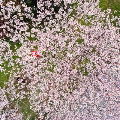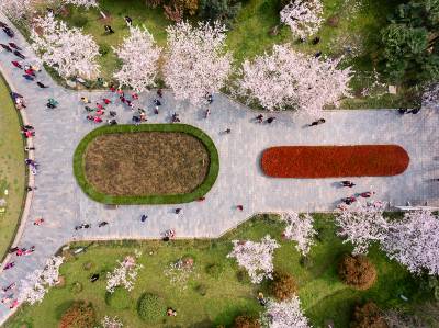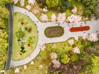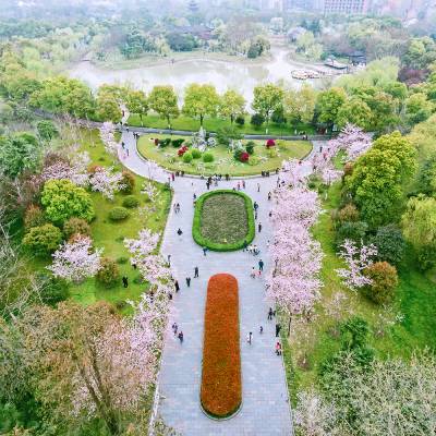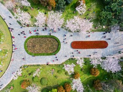 2017.3.18航拍摄武汉市江岸区堤角公园。堤角公园风景如画 600余株樱花悄然怒放,鸟瞰堤角公园樱花灿漫,盎然春意。