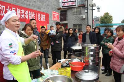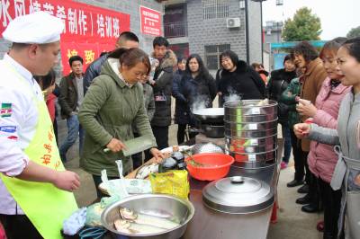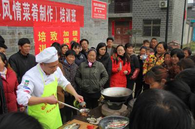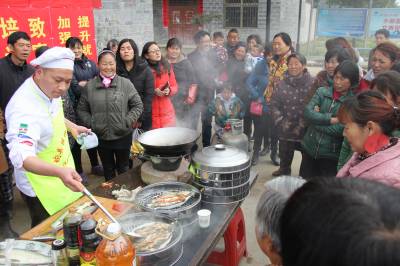 3月22日,位于南水北调中线核心水源区的丹江口市均县镇关门岩移民村一农家院前,厨师正在为移民传授“汉水鱼”烹饪技术。当日,该市汉江科技学校与市移民局联合承办的的移民中式烹饪(汉水风情菜肴制作)培训班在这里开课,邀请市内名厨讲解“汉水鱼”、“均州八大碗”等本地特色菜的烹饪方法,并手把手指导学员进行操作实践,有66名村民接受了免费技术培训。 视界网 钱芹 通讯员 李元波 摄