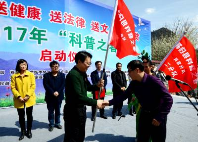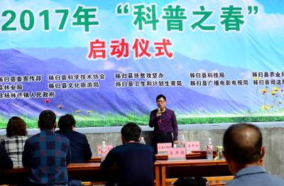 3月27日,三峡库区秭归县2017年“科普之春——送科技、送健康、送法律、送文化•助脱贫”活动在该县杨林桥镇响水洞村启动,由县委宣传部、科协、扶贫、卫计、科技、司法等10个部门组建的三个科普小分队,将按照统一编制的工作方案分赴全县12个乡镇,除演一台戏外,还为农民群众免费赠送科技图书、药品、宣传资料等物品,并提供科技、法律、健康等咨询服务和“点餐式”技术知识培训,助农脱贫致富。