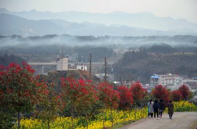 28日,宣恩县李家河镇居民在山花簇拥下的游步道休闲徒步。 该镇抢抓“绿满荆楚”机遇,积极打造园林乡镇,大力种植绿化树,构建宜居环境,极大提升了人民群众幸福感和获得感。