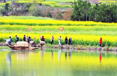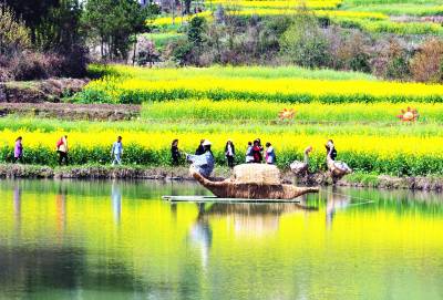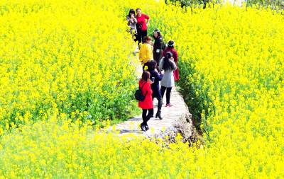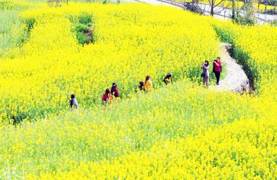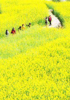 31日,游客在牛洞坪村油菜地里游玩。 当天,巴东县东瀼口镇牛洞坪村举办第二届菜花节,成百上千亩油菜花盛开,吸引了上千名游客踏青、赏花、徒步、拍照,与春天约会。(视界网 梁勇 摄)13986846069