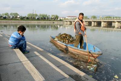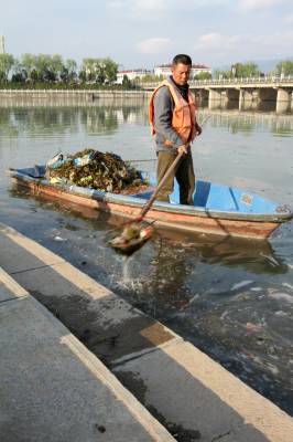 4月4日,房县河流保洁人员在清理城区三道河半岛湾河面漂浮的垃圾。当地建立责任连锁机制,将综合治理贯穿县城腹地的“母亲河”水环境,与河流、水环境管理部门和沿河两岸乡镇、企业工作业绩挂钩,同步考核,限期治污不达标,依法依纪追责,摘悼“乌纱帽”。目前,完成投资6亿多元,完成生态治理河道53公里,进一步净化河流水质的污水与垃圾设施改造提标工程正在建设,“水清、岸绿、河畅、景美、生态”的河道水环境己经形成。