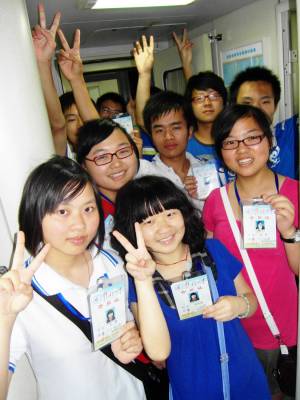 【罗超】清华北大,是多少莘莘学子的梦想。7月1日,湖北省2010年高考理科状元高中——钟祥一中,50余名高二学生随着”胸怀成才梦走进清华园”活动,从家乡来到北京,提前感受心中的大学名校风采,再激早日成才雄心大志。图为部分高中生在赴京K50次列车上兴奋地合影留念。