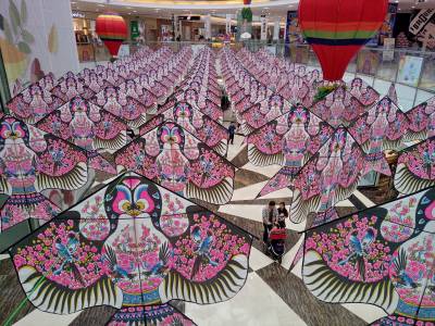 在武汉市汉口菱角湖万达广场中庭里,有百余个春暖花开的燕子齐飞风筝,悬掛在空中,装饰在广场内,美不胜收。给前来逛场购物的消费者,带来了春意盎然感受,感受到满脸春风扑面而来。