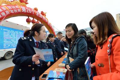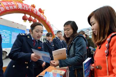 当日,保康县国税局、地税局在该县紫薇广场联合开展以“深化税收改革、助力企业发展”为主题的全国第26个税收宣传月活动,税务人员以发放宣传资料、接受相关咨询、微信扫码等多种形式,向居民宣传税法相关知识。(视界网杨韬摄)
