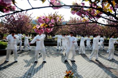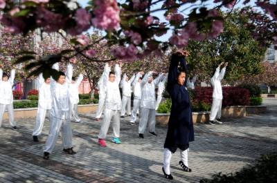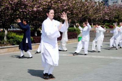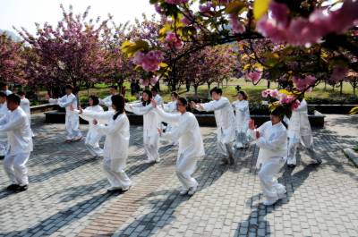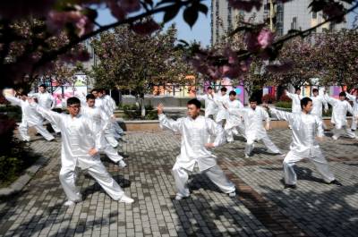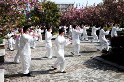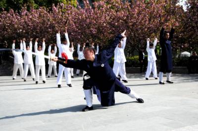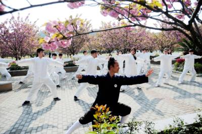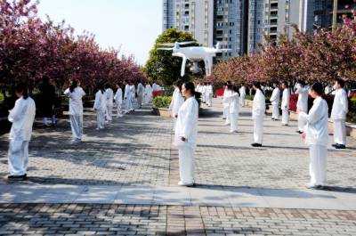 4月12日上午,湖北工业职业技术学院樱花长廊前,来自十堰市近千名太极拳爱好者身着太极服,在此集体展演武当太极拳。众人起舞间,缓慢轻盈的九式太极与和山、遇湖、樱花融为一体,美不胜收,场面既浪漫又震撼。