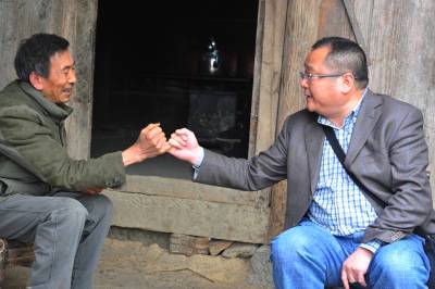 拉勾脱贫(图) 4月12日,咸丰县高乐山镇白岩村8组,恩施州财政局副局长赵洪与建档立卡贫困户高景恰“拉勾”许下精准脱贫结对帮扶承诺。 当天,恩施州财政局组织机关干部职工到驻点贫困村——白岩村,开展结对帮扶“五个一”活动,即为结对帮扶贫困户办理一件力所能及的实事、谈一次心、购买一些农产品、制定一个脱贫计划、算一次脱贫账。 (视界网 李维君 摄)