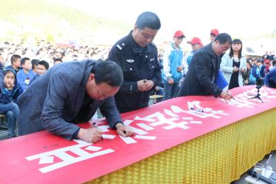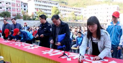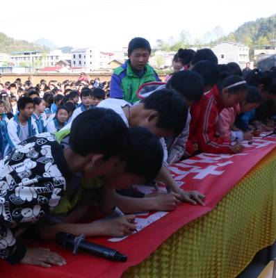 600余名师生争当“七五”普法义务宣传员 4月13日,竹山县竹坪乡“七五”普法启动仪式,在该乡中学举行,600余名师生在“执法必严违法必究”的横幅上签字承诺,争当“七五”普法义务宣传员。视界网 张云朝摄