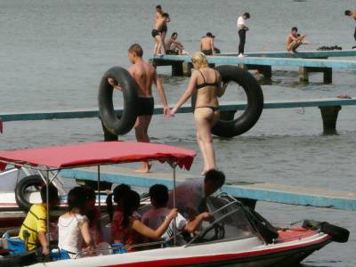 7月1日下午4点多钟,在武昌凌波门东湖天然游泳池,有两位外国人身着泳裝,走向游泳池,面对突入袭来的外国女人光着屁股走,在场游泳的市民和大学生和船上游人都以接受,没有人喧哗喊叫,从一个侧面反映了武汉人己熔于了改革开放,另一个侧面反映了外国朋友在汉随乡入俗,把武汉当成自已的家乡一样,游得高兴,玩得开心。7月4日中午11点多钟,一位老外在武汉长江大桥武昌桥头绿阴下,纳凉享受江面上吹来的风。