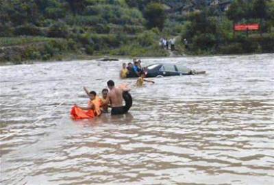 4日,郧县大堰乡伍子溪风景区突发山洪,30余名游客躲避不及,遭洪水围困,一名小女孩被洪水卷走,生死不明。当地7名消防员和警民及时赶到,展开了一场生命大营救……至当晚20时许,30余名被困游客全部获救,一小女孩子不幸溺亡。(本报视界网徐雁初李镇海摄)