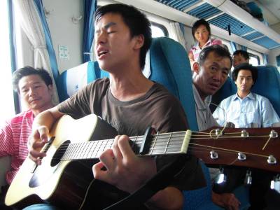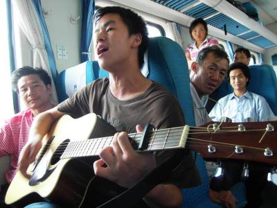 【罗超】7月2日上午9时许,石家庄铁路职业技术学院的一名十堰郧县籍大学生吉他社长张智同学,在K279次暑假返乡列车上,为消除旅途困顿,活跃车厢气氛,取出吉他,随着弹奏放声歌唱《朋友》、《童年》、《勇气》等大家耳熟能详的热曲,引得周围旅客精神振奋,随声附和,整个车厢充满了欢乐与和谐。图为十堰大学生吉他社长张智同学正在怀抱吉他引吭高歌。