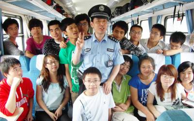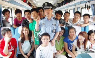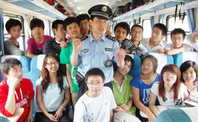 【罗超】2010年暑运已经拉开大幕。面对当前闷热天气,襄樊铁路公安处广大民警战高温冒酷暑,积极行动,奋战在千里铁道站车一线,保安全,除隐患,打防结合,营造出一个平安和谐的暑运环境。图为该处列车乘警给大量返乡的大学生集中宣讲乘坐火车安全防范常识。