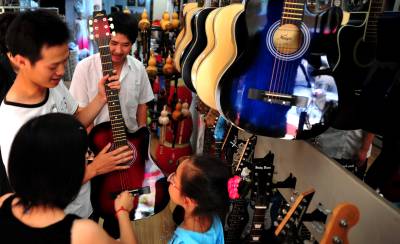 暑假来临,湖北恩施州城各乐器店随着假期乐器培训班的升温而异常火热,吉它、古筝、电子琴等乐器成了俏手货,前来选购的学生络绎不绝。