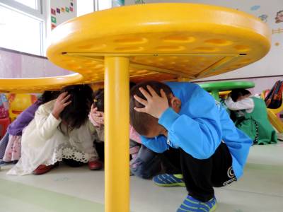 上午9时38分,随着一阵急骤的警报声响起,校园广播里发出险情“地震!”预报,学前班的幼儿迅速在课桌下避险,小学生在安保人员的引导下,双手抱头、弯下身子沿着安全疏散通道有序撤离到学校操场空旷地带集结,用时2分38秒。随后,政教处向全体师生宣讲了紧急避险安全意识和逃生自救等安全知识讲座。旨在达到“教育一个孩子、带动一个家庭、影响整个社会”的防灾减灾宣传效果。(视界网 刘东 摄 13971936840 )