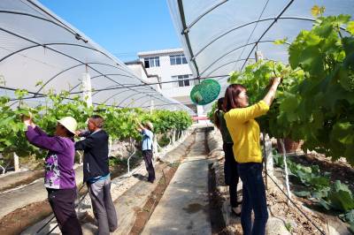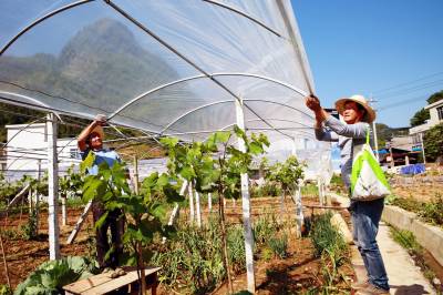 13日,巴东县官渡口镇西溪坝葡萄基地一角(图一)几名社员在建避雨棚(图二),部分社员在葡萄树上抹芽、捆技、疏花(图三),园内一片繁忙景象。