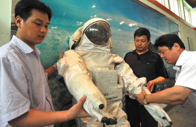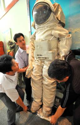 7月6日,由中国科技馆捐赠的八套航空航天展品运抵襄樊市科技馆。这些展品包括神舟飞船模型、六活塞航空发动机、航天飞机搭载的多媒体、万有引力演示仪等,价值上千万元。图为中国科技馆捐赠的宇航服。