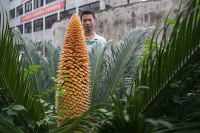 雄铁树开花(附图)开花的铁树(7月7日摄)。俗话说:”千年铁树开了花,万年果树要发芽”。日前,在襄樊电务段机关院内一棵雄性铁树开花了。其如玉米形、色为金黄、约60厘米高的花,无不让人啧啧称奇。更让人称道的是,这也是该铁树连续第3年开花。据园林专家介绍:铁树学名苏铁,属于热带植物,是地球上现存的最原始种子植物之一,有”植物界大熊猫”、”活化石”之美称。已列为国家重点保护野生植物。铁树分为雌性和雄性,雄性铁树的花呈圆柱形,颜色嫩黄,雌性铁树的花呈半球状。据了解,苏铁树姿刚健,挺拔秀丽,四季常青,自然景观优美,是一类具高观赏价值的园艺植物。其根、叶、花及种子皆可入药,有止咳、治痢、止血、益肾、降血压等功效。据最新研究还具有抗癌的作用,是一种珍贵的天然药物。通联:湖北省襄樊市樊城区铁院东路8号襄樊电务段党群办:王樊明摄邮编441003联系电话0710-3021356、3022476