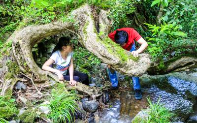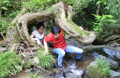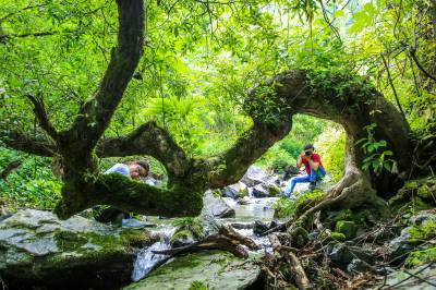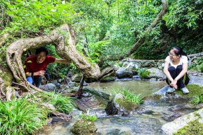 2017年5月13日,游客在竹溪县鄂坪乡正在修建游步道的龙王溪景区观赏天然独特景观柳、拍照留影。