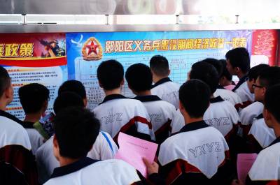 5月16日,十堰市郧阳区武装部组织相关部门负责人深入区第一中学和第二中学进行夏季征兵宣传和动员,在区第一中学校园内工作人员将<<国家和湖北省主要惠兵政策>>和<<郧阳区义务兵服役期间经济收益一览表>>张贴到宣传内,当天共向学生们发放<<让青春的梦想在军营自由飞翔>>的公开信11000多份,要求当兵的学生们迅速在网上注册登记。 视界网周家山 摄
