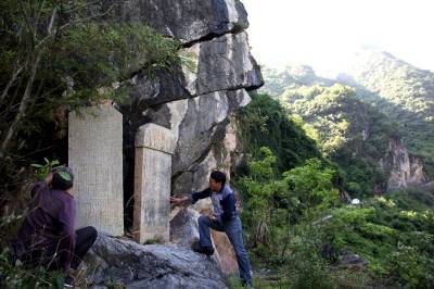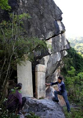 在谷城县南河镇东坪村南河断头岩的陡峭岩石上立着3通古石碑,分别为清乾隆四十年、四十一年、五十七年所立,其内容记载了此地住户在断头岩修路捐款的人名和钱数,成为研究当时民风和公益事业的实物,具有较高的文物价值。三通碑自立至今从未移动过,历届村委会都把古碑视为“宝贝”明确管护制度,落实村民责任,不允许任何人损坏,村干部也时常察看,使古碑得到了很好地保护。5月16日,村党支部书记、村委会主任谭辉(右)在介绍古碑保护情况。