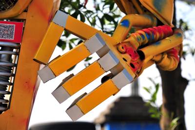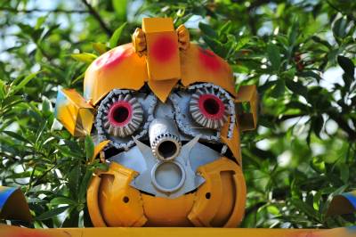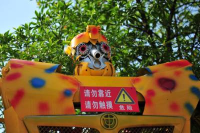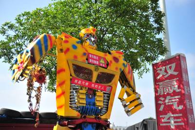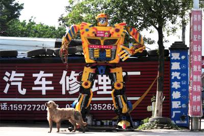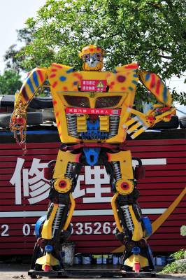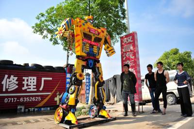 近日,在宜昌市夷陵区一家汽车修理厂,一个利用废弃汽车零配件制作的“变形金刚”招牌摆放在修理厂门口,成为一道吸引眼球的风景。据修理厂工人介绍,这个“变形金刚”模型高3米、重400公斤,是他们利用半年业余时间,由报废轿车、摩托车的零配件加工制作而成,包括齿轮、曲轴、发动机、减震、油箱、排气管、轮毂等100多个零配件。“变形金刚”全身以橘黄色为主调,身上都是优美的“肌肉线条”,威武雄壮,充满了金属力量。视界网 张国荣 摄
