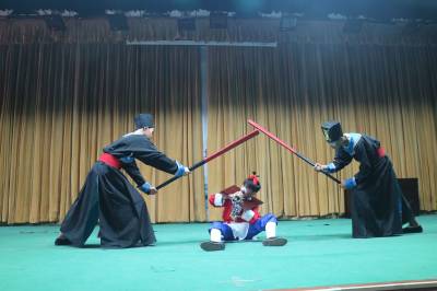 课本剧《变色龙》、《茅屋为秋风所破歌》演员们形象逼真的动作表情,完美的情景设置,给人一种全新的感受,让观众们大饱眼福;黄梅戏《女驸马》、曲剧《卷席筒》、京歌《说唱脸谱》则让师生都沉浸在中国古典艺术的优美旋律中,把会场气氛一次次推到了高潮。
