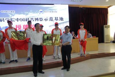 现场中国科学院与丹江口市签订全国首个科普博览示范区和湖北省首批三个科普示范基地”的协议,并授牌匾。