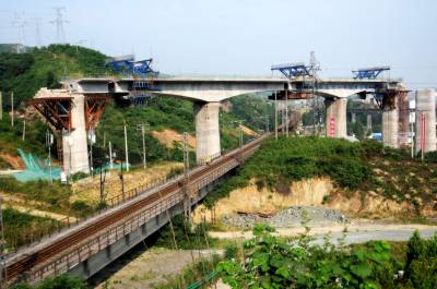 由中铁十一局承建的汉十高铁六里坪跨襄渝铁路特大桥是汉十高铁控制性工程之一。特大桥分别跨越襄渝铁路和316国道。为了解决施工难题,项目在设计之初就设计了转体施工方式。此次桥梁转体施工横跨襄渝铁路桥墩高度28.5米,桥墩之间最大跨度64米,单个梁体重量达到520吨。19日上午7:30分,两个桥梁单元转体同时进行,转体角度为34度,9:20分结束,历时120分钟,成功跨越襄渝铁路。