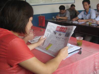 王义贞镇举行学习严大平同志先进事迹座谈会7月7日,王义贞镇副镇长陈颖正在学习严大平座谈会上和入会者一起学习当天刊登在《湖北日报》头版的长篇通讯《”韧书记”严大平》(图一)。自《湖北日报》、《孝感日报》等新闻媒体连续刊登了安陆市王义贞镇三合村支书严大平的先进事迹后,严大平的典型事迹已经在老区王义贞内外引起了强烈的反响。7月6日至7日,该镇已举行三场学习严大平同志先进事迹主题座谈会,逾千名干部、群众参加了座谈会,近50名干部、群众在座谈会发言。镇委书记刘章彬在座谈会发言(图2中);座谈会会场(图3)。签约摄影师:王代金