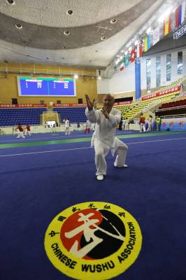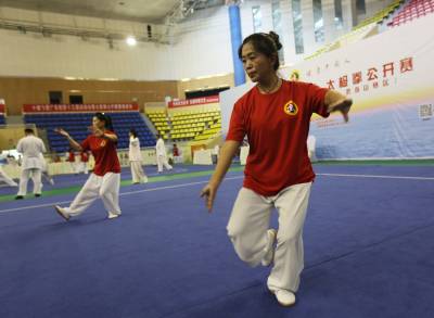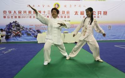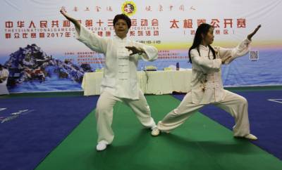 5月20日,第十三届全运会群众比赛暨2017年太极拳公开赛(武当山赛区)举办地----武当山国际武术交流中心场馆周围彩旗飘扬,馆内太极拳运动员正摩拳擦掌、舞鞭弄剑,一派喜庆热闹。自19日起至24日,由国家体育总局武术运动管理中心、中国武术协会主办,湖北省体育局武术运动管理中心、武当山旅游经济特区管委会承办的第十三届全运会群众比赛暨2017年太极拳公开赛(武当山赛区)在武当山举行。此次比赛为全国性大赛,共分4个赛区,武当山赛区将迎来华北、华中地区运动员报名参赛,截至目前,来自北京、天津、河北、河南、湖北、安徽、江西等省市的102支参赛队、近1200名运动员报名参赛。( 郭军 摄)