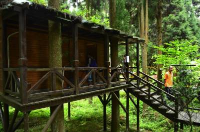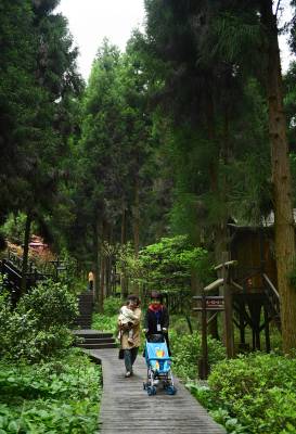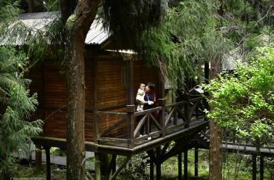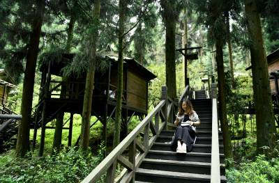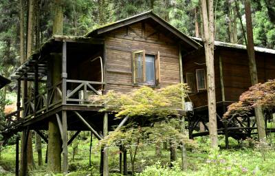 雾里春溪 花映木屋