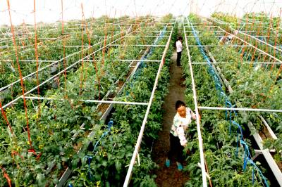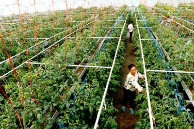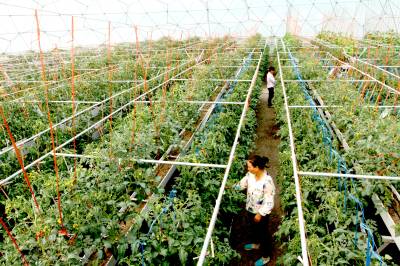 2017年5月20日,技术人员正在房县禾益生态农业观光园“蒙古包大棚温室”管理无土栽培槽的西红柿。当地在“蒙古包大棚温室”搭建无土栽培槽架,采取立体种植全生态、符合欧盟标准的西红柿、黄瓜等蔬菜,供旅游观光、采摘,实现农业降低成本、增加效益的目的。据悉,大棚温室无土栽培缩短植物成熟时间三分之二,提升土地利用效益6倍,2000亩牡丹花观赏、果蔬釆摘基地等农业观光项目年实现收入超过1.5亿元,带动2000名农民增收。