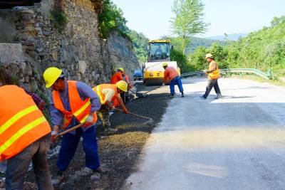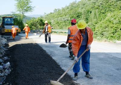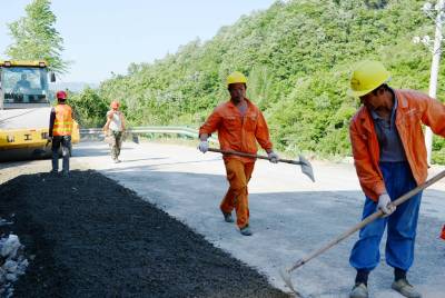 5月22日,工人在保康县歇百路百峰段进行路面施工作业,现场一派忙碌。
