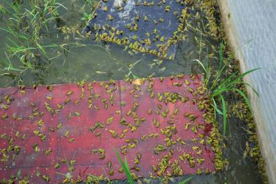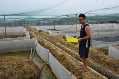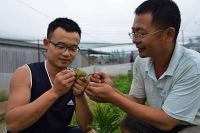 大学毕业养青蛙 5月22日,宜都市枝城镇全心畈村,肖腾(图1左)与父亲在观察青蛙生长情况。肖腾是宜都市陆城街办人,2014年从三峡大学毕业后,到全心畈村流转8亩地,与父亲一起养殖青蛙。预计今年秋季可产青蛙6000公斤,创收20万元。