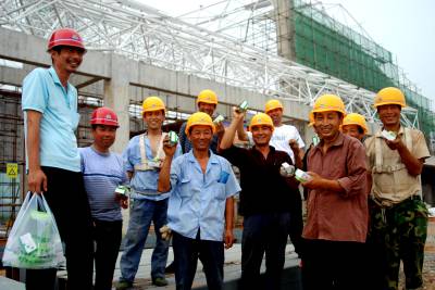 7月7日,恩施市火车站的建设们刚刚领到公司统一配发的防暑药品,一个个高兴地笑了(图一)。酷暑到来,为了赶在今年9月份完成火车站的建设任务,工人们每天都在似火的骄阳下忙碌,汗流浃背(图二)。为了防止工人在建设过程中因中暑引发安全事故,承建恩施火车站的中铁一局集团有限公司免费给工人们发放了一批藿香正气水和风油精等防暑药品,露天作业的建设者在施工过程中随身携带药品,随时都可预防因高温引发的身体不适(图三)。