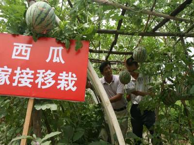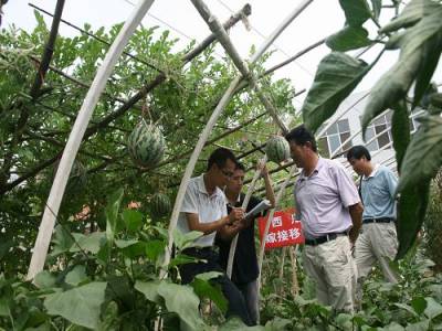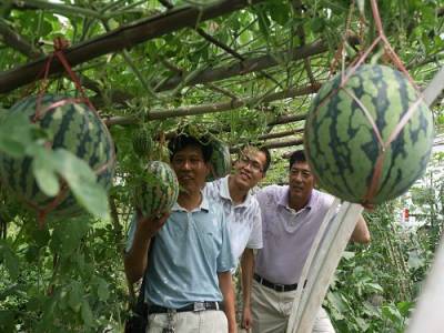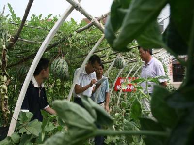 立体种植创高效7日,天门市大学生”村官”祁杰(左一)在立体种植基地测产。为发展高效农业,提高土地利用率,该市林英无土育苗协会今年3月底在小板镇黄金村、蒋湖农场等地立体种植无土育苗嫁接西瓜套种茄子300余亩,目前,平均每亩已收获西瓜4000公斤、茄子4200公斤,预计亩产可创收2.4万余元。(本报视界网刘银斌摄)