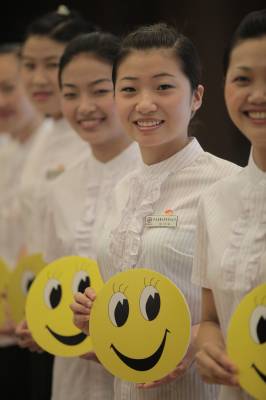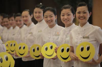 微笑迎宾7月8日,女服务员正在参加微笑服务月活动。当日,宜昌城区沙龙宴酒店开展”传递文明花、微笑送大家”活动,要求全体员工微笑迎宾,热诚服务,为创建全国文明城市贡献力量。本报视界网黄翔摄