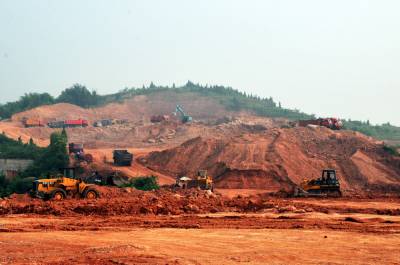 7月6日湖北省郧县汉江南岸的经济开发区建设如火如荼,而引资最大的项目,投资10亿元的川路工业园建设更是如火朝天,各型机械车辆正在开山平地.川路工业园占地1136亩,厂区建成后将生产经营专用车辆,预计年产总值153亿,实现利税10亿元以上,目前开山平地工程己经过半,10月开工建厂.图为正在开山平地的川路工业园建设时的情景.周家山摄湖北省郧县城建监察大队电话13872840078邮编4425000