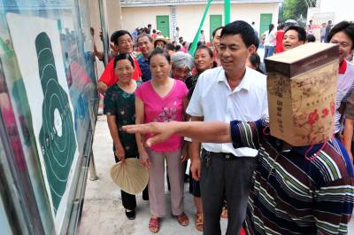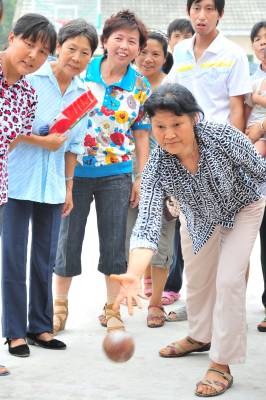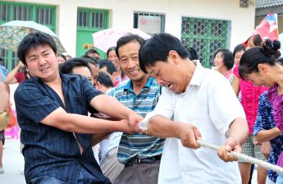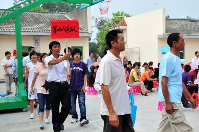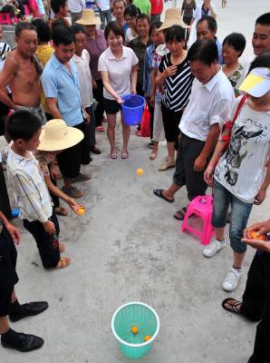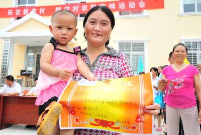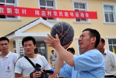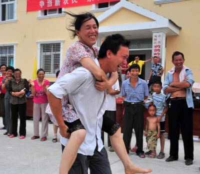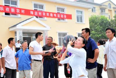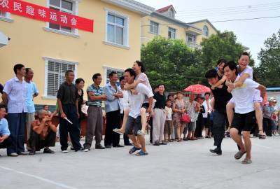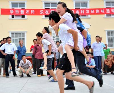 2010年7月8日,湖北省宜昌市夷陵区新型农民教育活动试点村——鸦鹊岭镇梅店村举行首届”争当新农民、乐在新农村”农民趣味运动会,来自该村120多名农民运动员进行了背媳妇赛跑、”盲人”摸靶、农家”保龄球”、投乒乓球、拔河、跳绳、定点投篮、打乒乓球等贴近农村生活实际的趣味运动比赛,展示了当地新农民的精神风貌和全新生活,吸引该村及周边乡村1000多农民观看。本报视界网张国荣摄