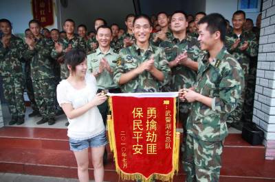 武警某部官兵勇擒劫匪受驻地政府和被救女亲属登门致谢蒋勇、杨德华报道:7月9日上午,洪山区政法委综治办副主任彭代平、洪山区珞南街政法委常务副书记沈新涛,专程来到武警湖北总队一支队一中队,看望慰问7月5日凌晨抓获劫匪的官兵,并送上2000元慰问金。下午,被救女袁钦的姐姐袁芳也专程赶到武警中队,送来”勇擒劫匪,保民平安”的锦旗,感谢武警官兵在关键时刻挺身而出抓获了劫匪,救了袁钦一命。(彭代平说:”洪山主要领导从报纸上得知武警官兵勇斗歹徒的事迹后,非常感动,专门作了批示,指出这次勇擒持械劫匪英雄事迹,是继袁凡之后,近期洪山区涌现出来的又一见义勇为先进典型,委托我们代表区领导,对武警官兵表示敬意!同时要求有关部门加强执勤巡逻,确保一方平安。”当地群众得知武警官兵勇擒劫匪的事迹后无不拍手称快,已有群众自发前往部队慰问见义勇为官兵。据警方透露:26岁的嫌犯陈少华,系广水市蔡河镇楼人,性格暴戾,作案手段残忍、老练,经过初步审讯,警方怀疑其与另外几起作案手段相似、专挑深夜抢劫强奸单身女子的案件有关,并涉嫌劫杀命案。目前警方正在全力侦破,最终结果要等审讯和取证结束之后才能公布于众。7月5日凌晨1时38分,嫌犯陈少华窜至工大路洪兴巷一出租屋楼内,对一女子实施抢劫,并用铁锤猛击女子头部,住在对面的武警官兵听到呼救声后,迅速出击,经过一番搏斗后生擒了嫌犯。(图1为洪山区政法委综治办副主任彭代平向中队赠送慰问金;图2为被救女袁钦的姐姐袁芳也专程赶到武警中队,送来”勇擒劫匪,保民平安”的锦旗,锦旗中间为勇斗歹徒的战士孙沂磊)武警湖北总队政治部宣传处蒋勇(13469985680)