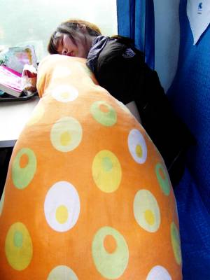 【罗超】如今,室外虽然是酷暑难耐,但在空调列车上却是清凉的世界。近日一大早,K49次旅客列车上一位美女旅客竟然把被子当成了超级枕头,枕眠御凉两不误,充分领悟了”饱带干粮暖带衣裳”之妙意。图为美女旅客正在奇思妙用超级”枕头”。