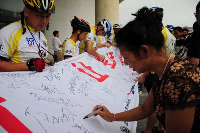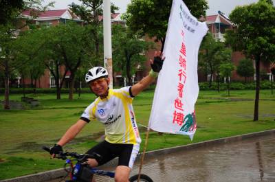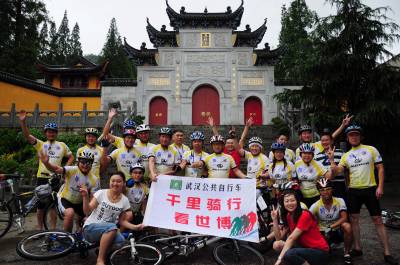 参加本次活动的21名车手骑自行车7月10日从武汉出发,穿行湖北、安徽、江苏、南京、上海等省市,经历7个昼夜,将于7月17日到达上海,庆祝上海世博会湖北周开幕。骑行全程约1200公里,骑行队伍将沿途传播”绿色出行,低碳生活”理念,并向社会展示免费公共自行车”武汉模式”的绿色形象。(王政摄)
