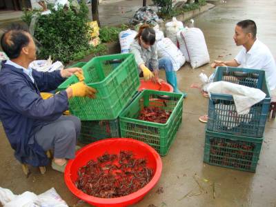 日前,每天早上,在汉川市麻河镇的各龙虾收购点就开始整理、装箱,将收购的新鲜生态小龙虾交给龙虾经纪人,托运到省内外各大水产品批发市场销售,其产品供不应求。图为7月10日早上,该镇周大平的龙虾收购点正在将龙虾按大小分类,准备装箱托运。通讯员邹开建摄影报道通联:汉川市麻河镇党政办公室电话:13197382491
