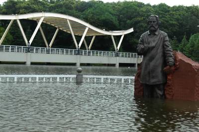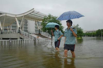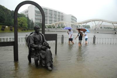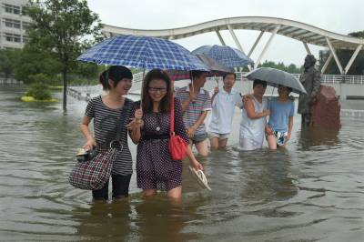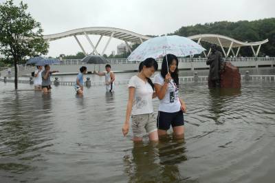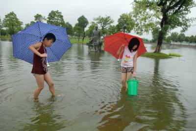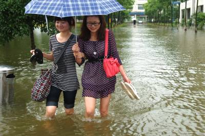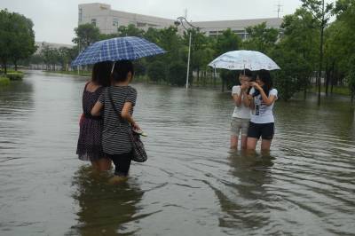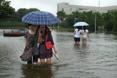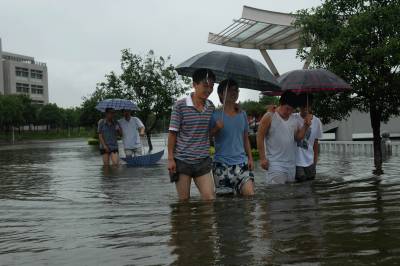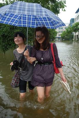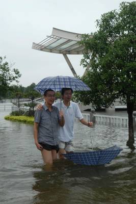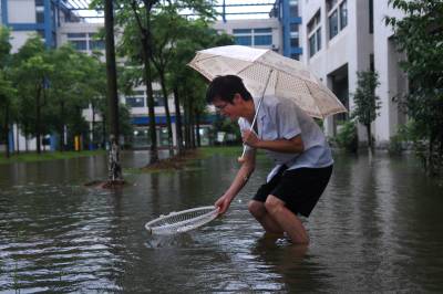 2010年7月12日,湖北经济学院,留校学子或在涨至膝盖的深水路中漫步,或在水中捕鱼,享受雨中乐趣。该校拥有湖水面积达150多亩,湖中碧波荡漾、鱼儿畅游,成为校园一大特色。随着连日豪雨,该校积思河畔湖水急涨,淹没了宽阔的校园道路,影响了师生出行。尽管雨大水阻,但读书生活还要继续。