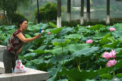 普通百姓的拍照乐趣。13日,襄樊阳春门公园,一老太正拿着手机拍荷花。随着拍照手机在老百姓中的普及,拍照已不再是少数专业摄影人士的专利。普通百姓已能随时拿起手中的拍照手机拍下自己身边感兴趣的事。